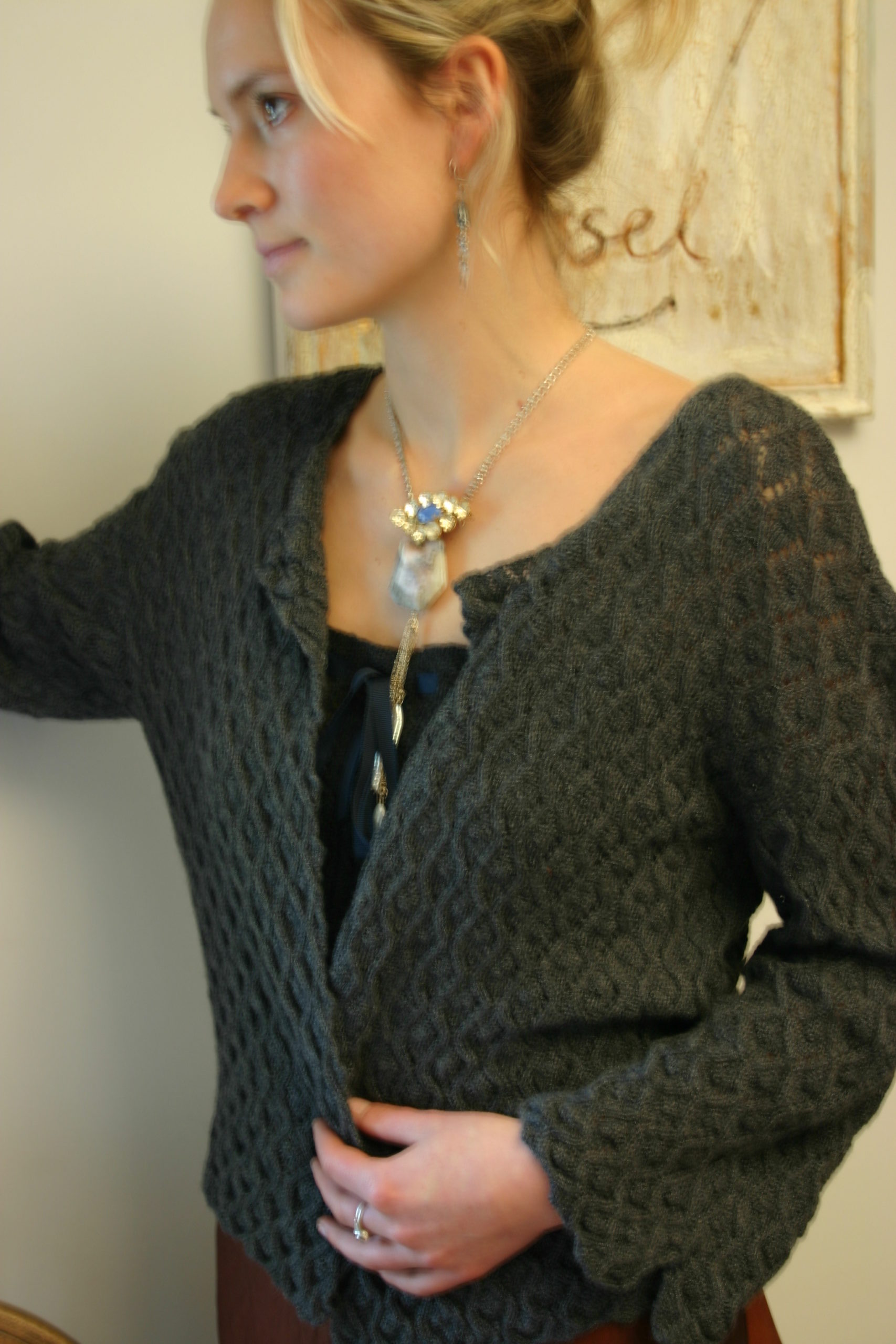 slouchy cashmere cardigan Posted 4th February 2015 by Jane Wheeler slouchy slate cashmere cardigan in wavy cable lace stitch