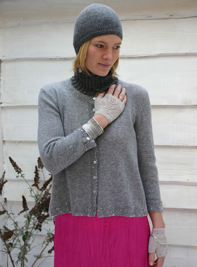 Published in a-line cardigan light grey cashmere w matt platinum sequins_ at 783 × 1060