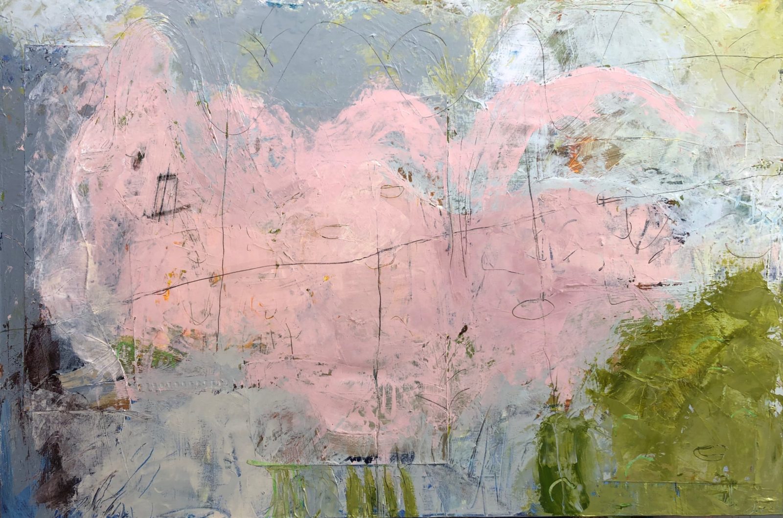 AT THE FIELD’S EDGE Posted 7th November 2020 by Jane Wheeler AT THE FIELD’S EDGE acrylic, pencil and collage on canvas 61 x 92 x 3.6 cm, 2020