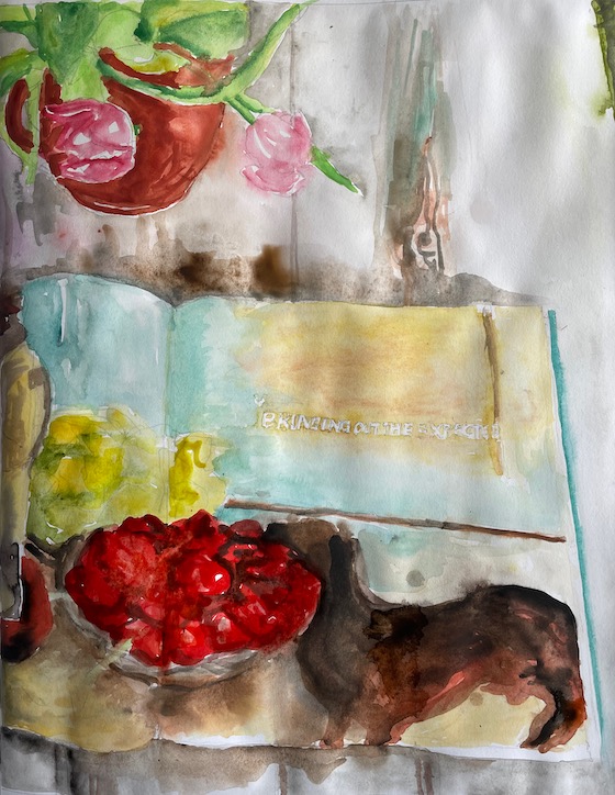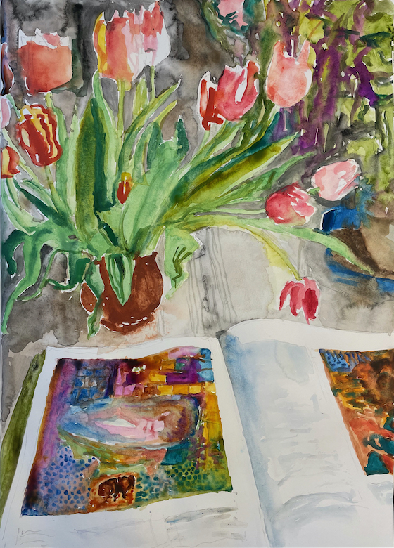 Bonnard book closed with tulips, watercolour on acid-free 140 gsm paper, 297 x 420 mm