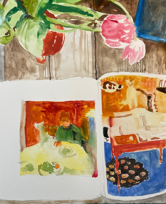 Bonnard book, feeding the pets, with tulips, watercolour on acid-free 140 gsm paper, 297 x 420 mm.