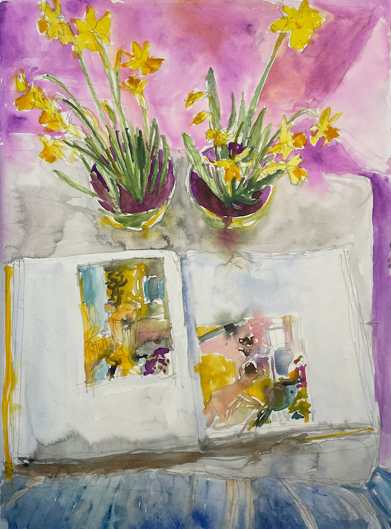 Bonnard book with tête a tête daffodils, watercolour on acid-free 140 gsm paper, 297 x 420 mm