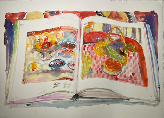 in March I bought a very large expensive and very beautiful book on Bonnard, by Isabelle Cahn, published by Prestel, full of marvellous illustrations, whole paintings and many detail photos. I went from painting piles of books to painting pages, double-spreads and part pages, as still lives.